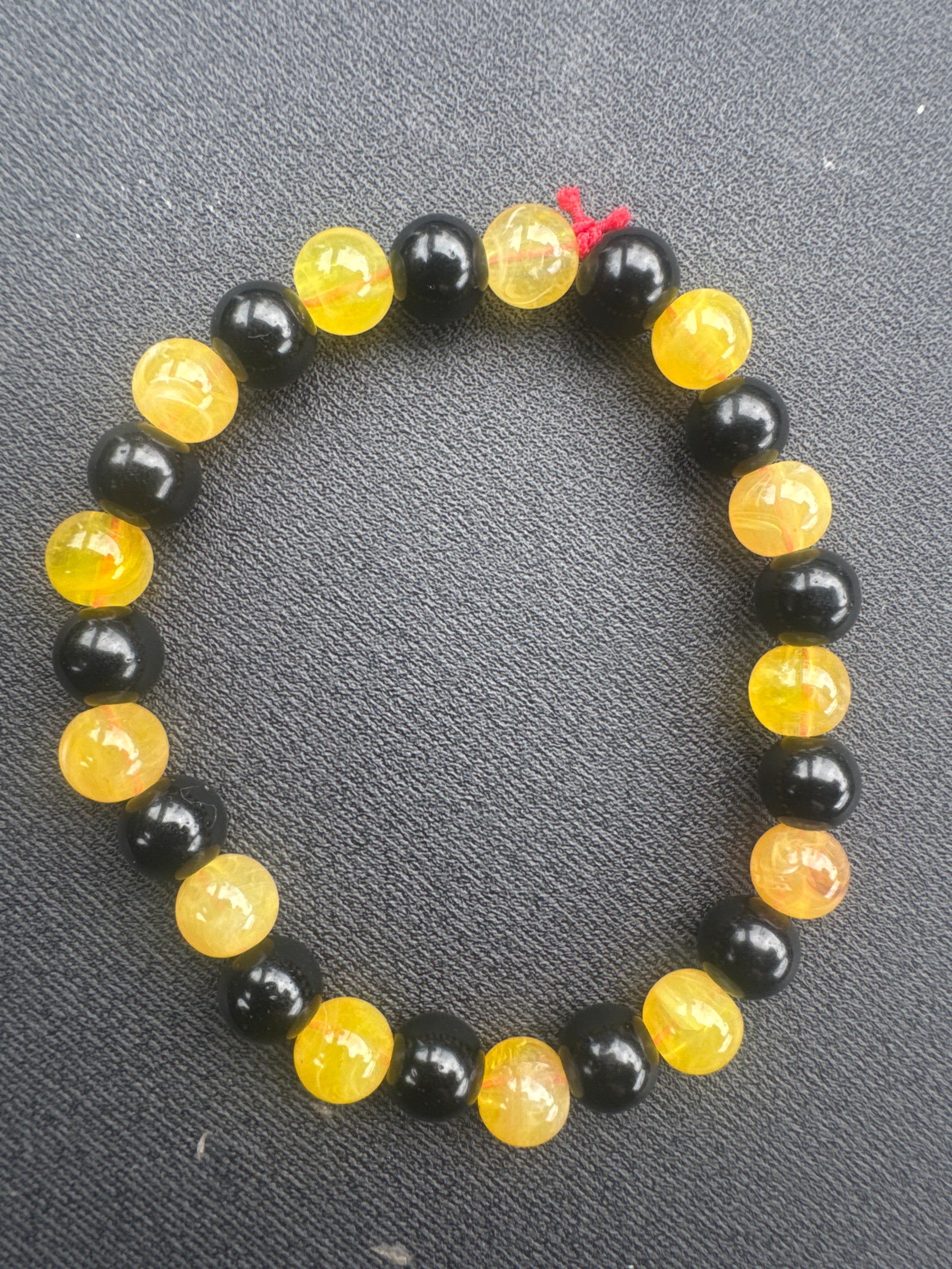 Introducing a striking beaded bracelet designed to turn heads with its bold contrast and clean simplicity. This piece features alternating glossy black beads and vibrant golden-yellow stones, creating a modern yet timeless look. Each yellow bead catches the light with a warm, translucent glow, while the sleek black beads add depth and balance.